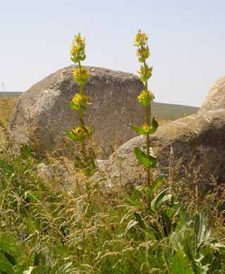 Plante haute de 60 à 120 cm qu’on trouve de juin à août sur un sol frais et ensoleillé. Son nom se rattache à Gentius, roi d’Illyrie au IIème siècle avant J.-C., qui aurait fait connaître ses propriétés. Elle met environ dix ans avant d’atteindre son plein développement et de fleurir. La gentiane contient un principe amer (gentianine) et fébrifuge ; on en arrache de grande quantité pour la confection d’un apéritif obtenu par macération de ses racines avec de l’alcool.
